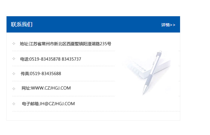 傳真:0519-83435688    郵編:213135    網址:WWW.czjhgj_com.etooninfo.com    電子郵箱:JH@czjhgj_com.etooninfo.com